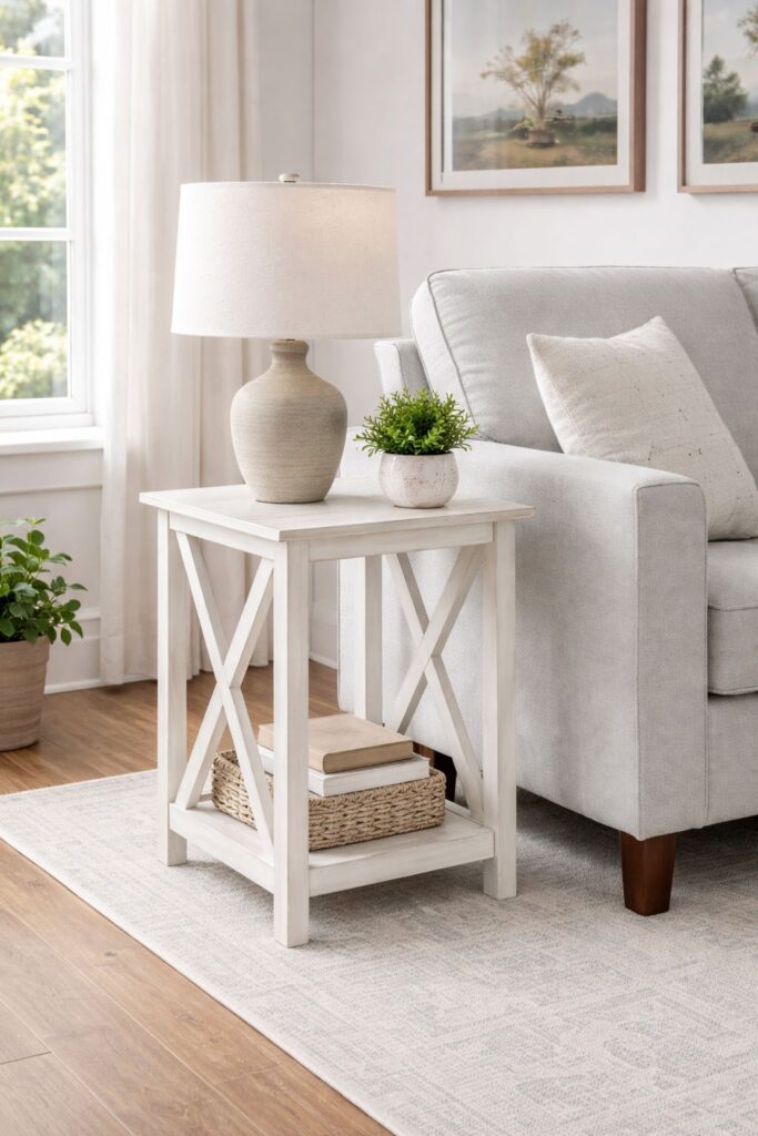The Jamestown Side Table is a quaint addition to a living room or bedroom. It’s crafted from medium density fiberboard and solid wood. A rustic antique white finish provides the final finishing touch. This rustic side table looks great when paired with decorative greenery, colorful vases, and your favorite framed photographs. To spread the farmhouse charm all over your home, be sure to check out the other Jamestown living room and dining room furniture from Boraam.