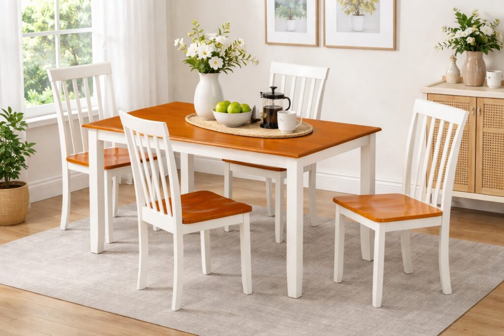 The 5-Piece Bloomington Dining Set is a reliable, versatile, and attractive option for your family. This five-piece set, which includes a dining table and four chairs, seats four. Add on two extra arm chairs to comfortably seat an additional two people. Engineered with a rubberwood frame and wood veneer, this farmhouse-style table and chairs set comes in your choice of two-toned finish combinations. Interested in making a 6- or 7-piece set instead? Simply add the Bloomington Bench or a few more Bloomington Chairs! However you style your Bloomington dining set, you can’t go wrong.