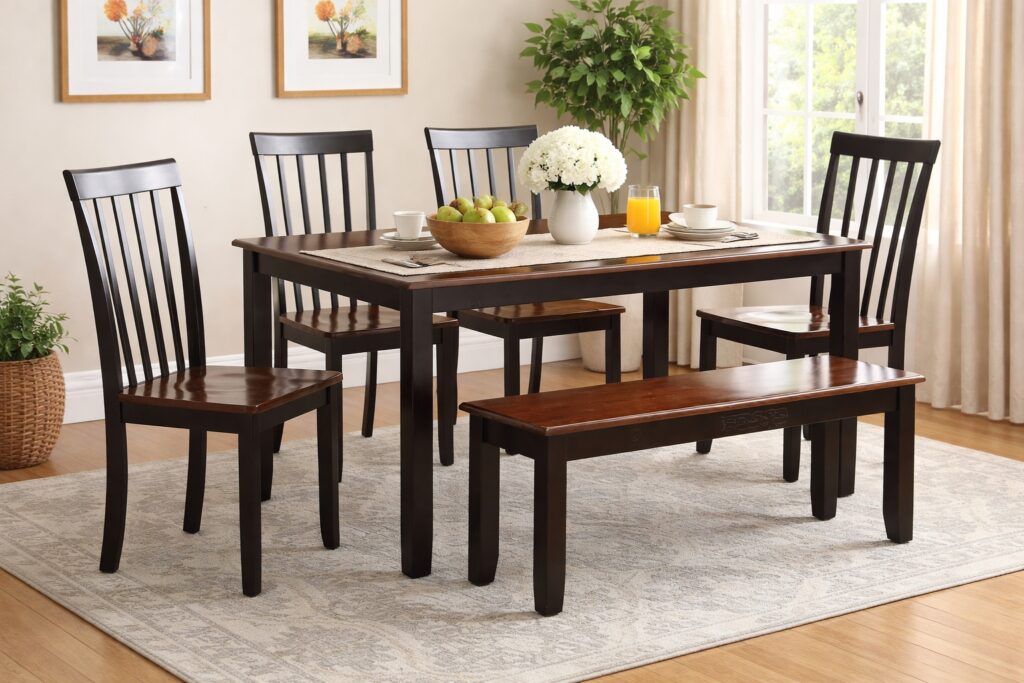The 6-Piece Bloomington Dining Set brings versatile style, precision craftsmanship, and Shaker good looks to your dining room. Crafted from solid rubberwood frames with medium density fiberboard and wood veneer accents, this set is ready to stand the test of time. Its easygoing design allows it to blend into any rustic, farmhouse, traditional, or modern home with ease. This six-piece set includes everything you need to redo your dining room: the matching dining table, four chairs, and a dining bench. All you’ll have to provide is the food! Choose your preferred two-tone color combinations: Black & Cherry or Cream & Honey Oak.