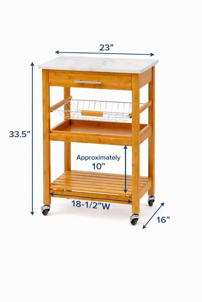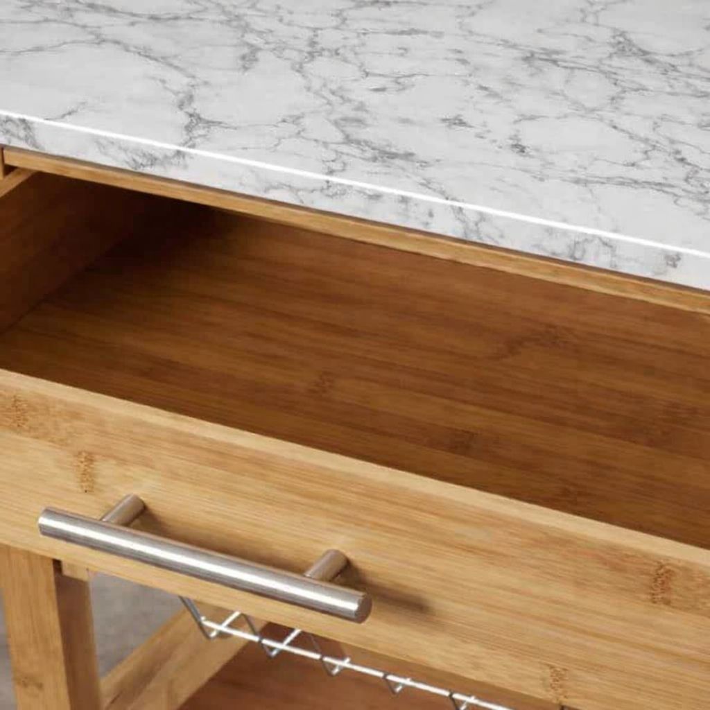 The Aya Bamboo Kitchen Cart makes it easy to take your entertaining skills up to the next level. Becoming a master host or chef is simple with the help of this kitchen cart. The bamboo wood frame comes in a warm natural finish, while the stainless-steel or faux marble top is a great prep station for chopping vegetables or mixing ingredients. A slender drawer holds spatulas, oven mitts, and other must-have utensils. Corral fresh produce in the open wire basket and stack glasses, bowls, and plates on the lower shelves. Bring flair to your kitchen with the Aya.