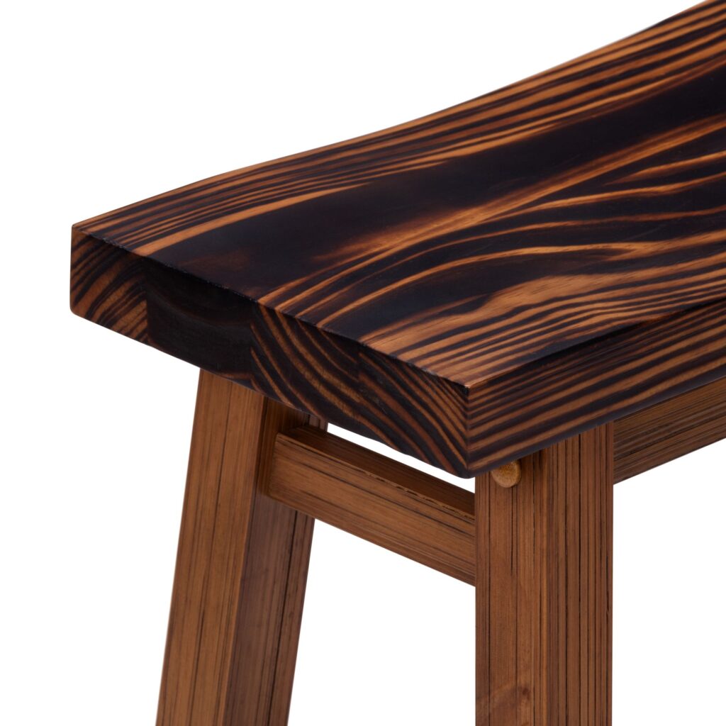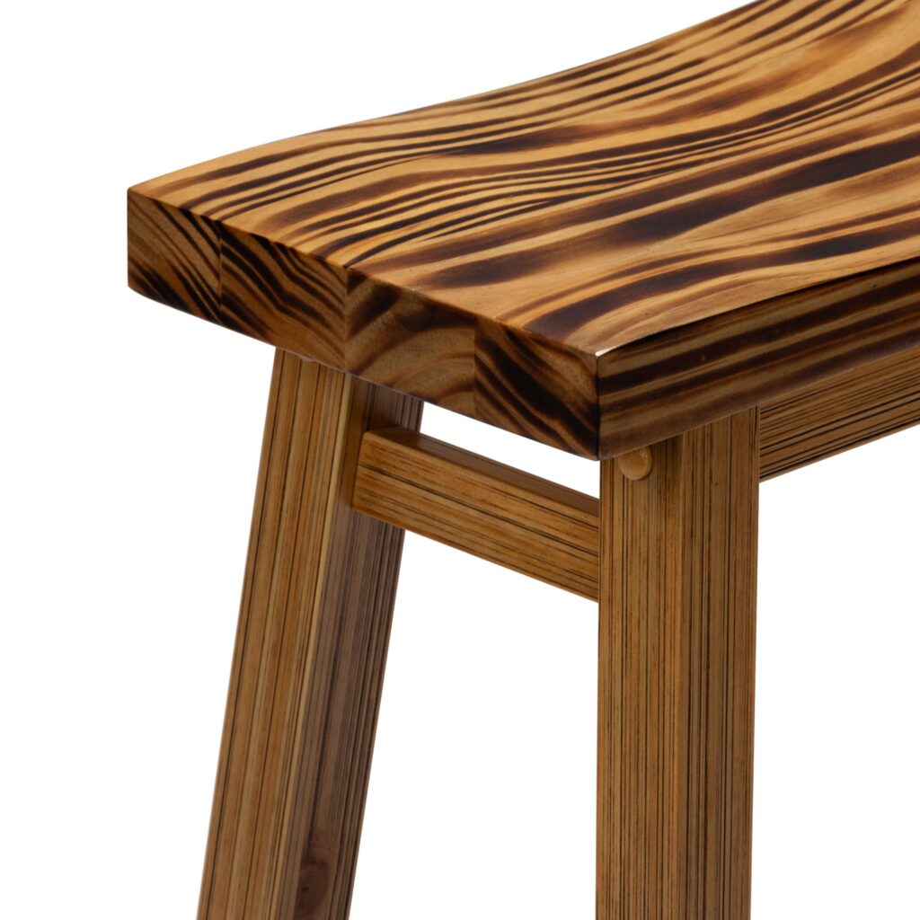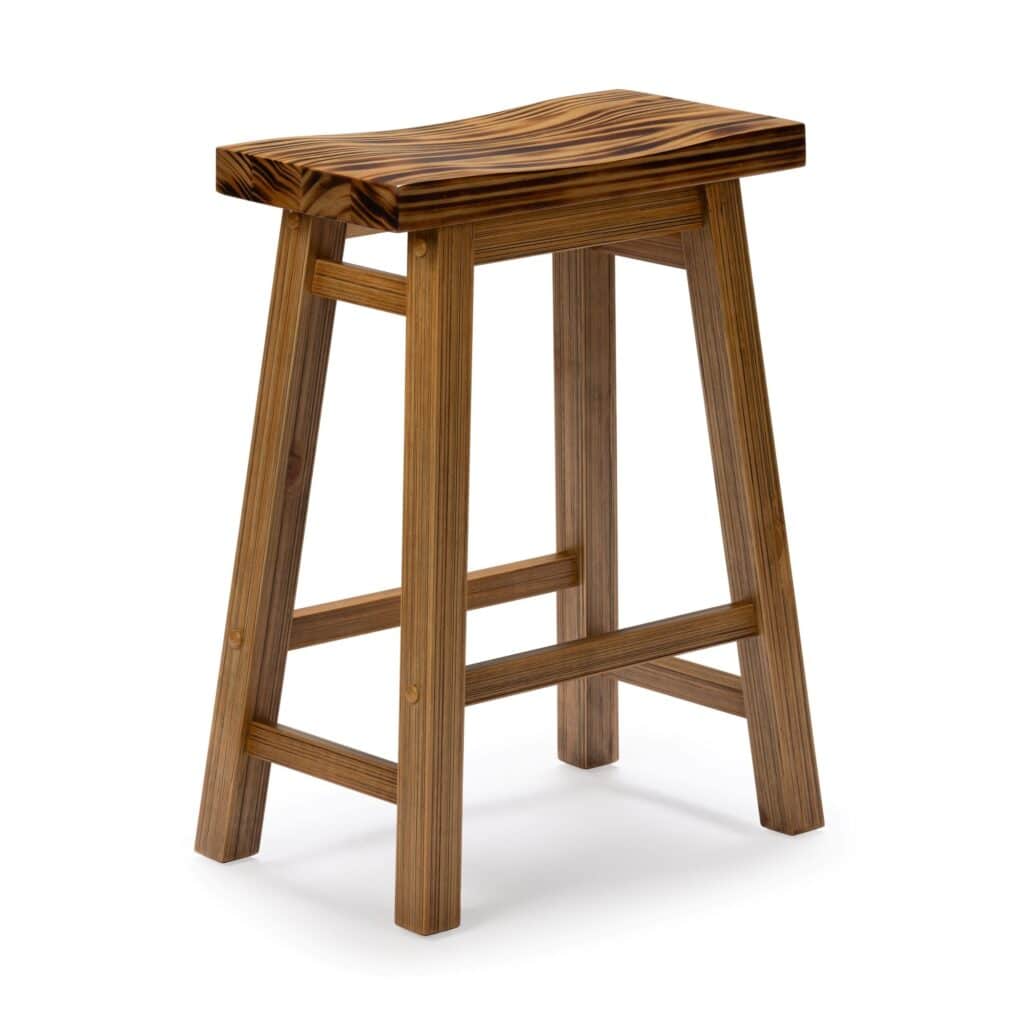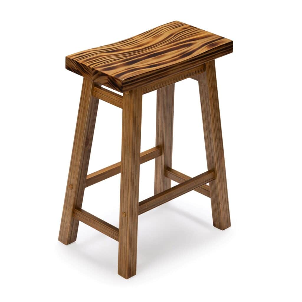 Bring warmth and character to your space with this beautifully crafted counter height stool, designed to blend rustic charm with modern simplicity. The sculpted burnt pine seat showcases a striking, flame-kissed grain pattern—each piece uniquely enhanced to highlight the natural beauty of the wood while offering a gently contoured surface for added comfort. Supported by a sturdy, solid wood frame, the stool features clean lines and angled legs for a stable, architectural silhouette. Reinforced stretchers provide durability and a convenient footrest, making it as functional as it is stylish. Perfect for kitchen islands, breakfast bars, or casual gathering spaces, this stool adds a touch of handcrafted appeal and effortless versatility to any setting.