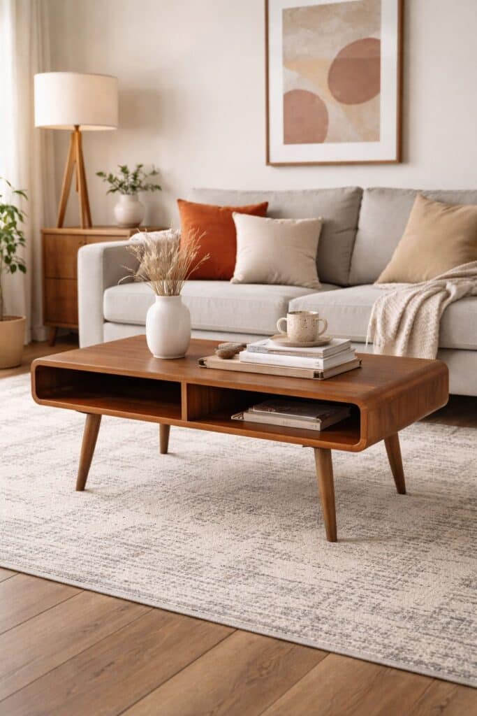 Presenting a stylish coffee table that harmoniously combines a clean-lined, mid-century silhouette with the warmth of light wood grains. Crafted from solid and engineered wood with a lustrous walnut finish, this table exudes a modern and updated aesthetic. Supported by four splayed legs, it offers a sleek and sophisticated look. The two open cubbies provide convenient storage for magazines, remote controls, and books, while the spacious surface is perfect for a coaster set and a vase of fresh flowers. With a width of 47.25”, it is an ideal choice for both cozy and spacious seating arrangements.