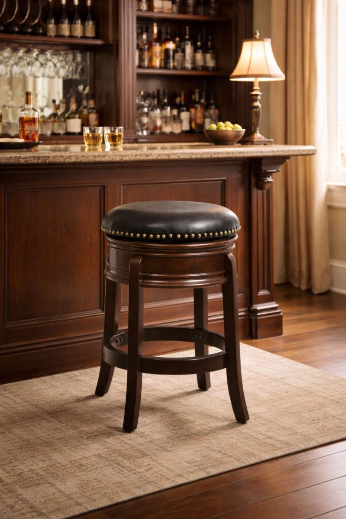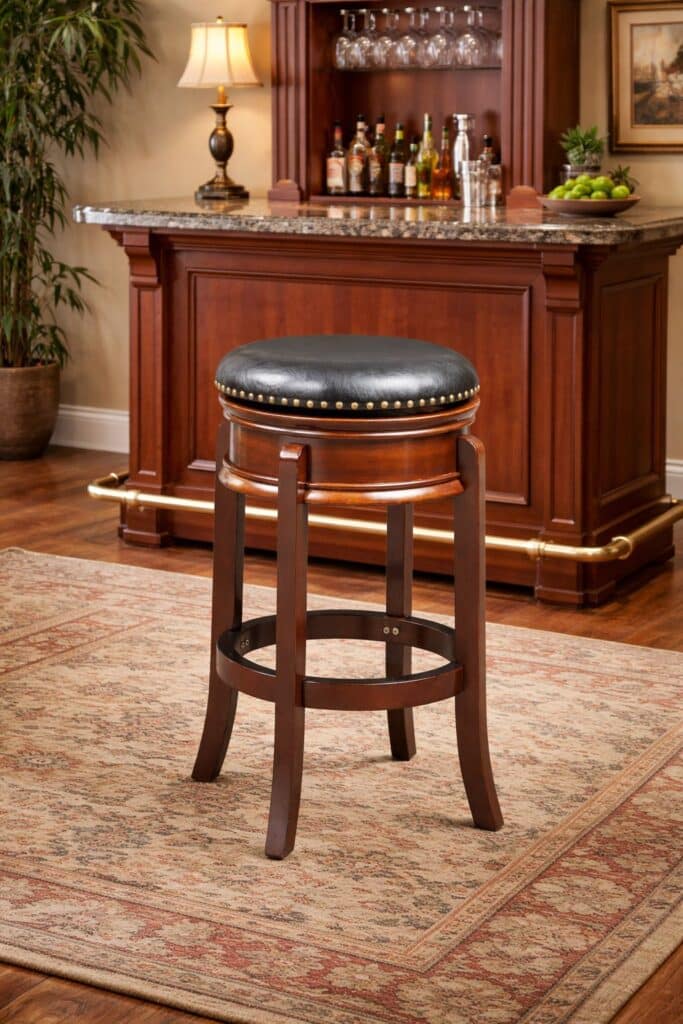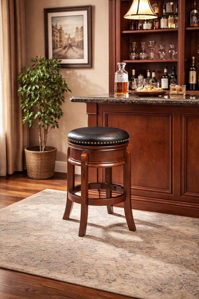 The Hamilton Swivel Stool’s sophisticated looks never go out of style. With a rubberwood frame and black faux leather upholstery, this swivel stool is engineered to perfection. Supported by a ball-bearing steel plate, the 360-degree swivel won’t let you down. Comfort and durability are of equal importance to looks, which is why the Hamilton is performance tested by leading worldwide testing facilities. Legs flare slightly underneath a circular stability stretcher, which is protected by a metal kickplate to guard against scuffs or scratches from your feet. This traditional swivel stool is a welcome addition to any game room, home bar, den, or kitchen. Choose your preferred size and finish from the available options to customize the stool to your space.