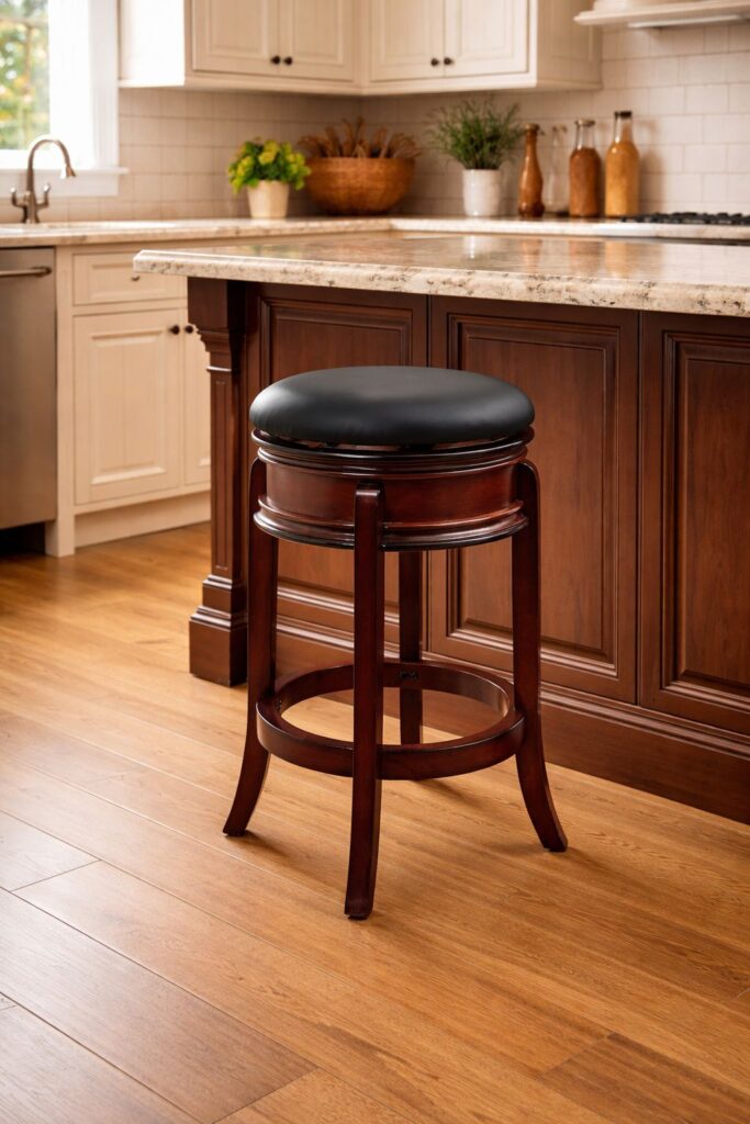 From cushion to feet, the Magellan Swivel Stool from Boraam exudes sophistication. This backless stool comes in your choice of counter or bar height options, perfect to pair with a home bar, kitchen counter, pub table, or den. The plush high-density foam is covered by a layer of black faux leather PU upholstery. Underneath, a precision-crafted wood frame features a molded apron, flared legs, and support stretchers for the best of looks and stability. A ball-bearing steel swivel plate supports the 360-degree swivel feature. This stool is performance tested by leading worldwide facilities to bring you longevity and peace of mind.