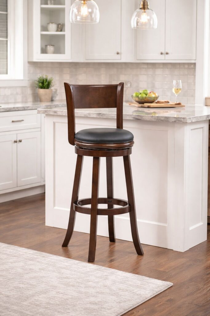 The Palmetto Extra Tall Swivel Stool is the next evolution of comfortable pub seating. Not only is this traditional swivel stool crafted with a built-in backrest, footrest, and high-density foam cushioning, but it also comes with support and durability features to last you a long time. Flared legs, a double-seat apron, stability stretchers, and a steel ball-bearing swivel mechanism all promise longevity. Not to mention, the Palmetto is also performance tested by leading worldwide testing facilities. The solid rubberwood frame is finished in beautiful cappuccino finish, and plush faux leather seating. Plus, its armless design means you can slide this stool underneath your countertop when not in use.