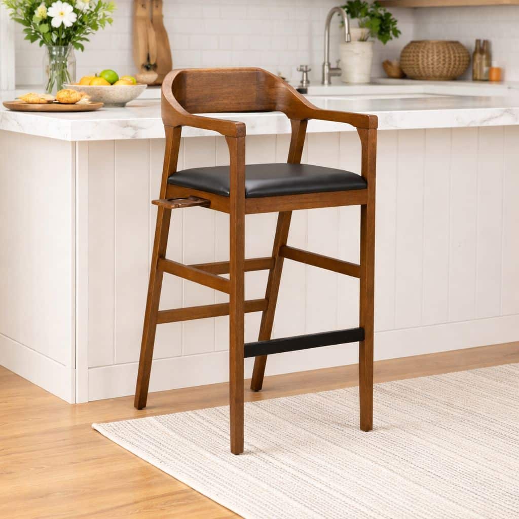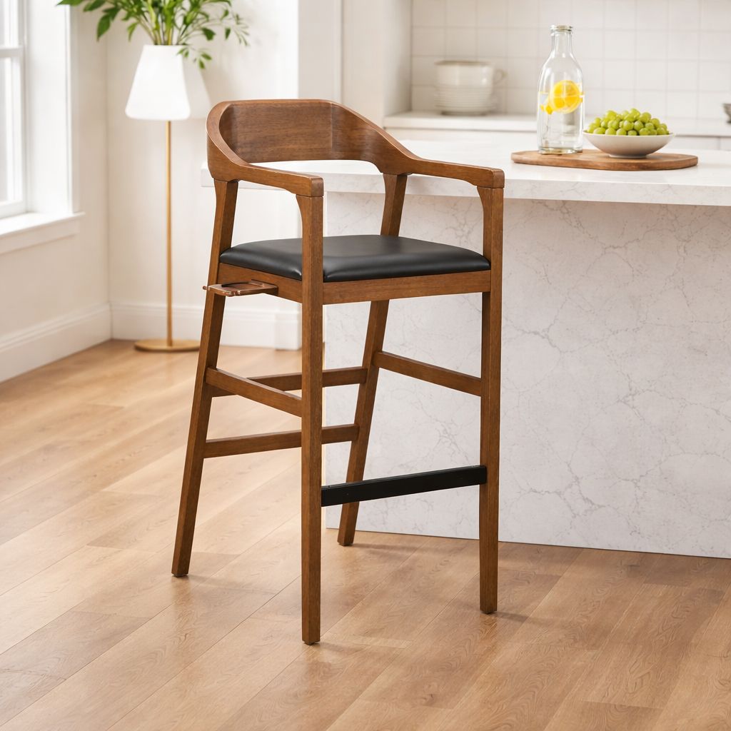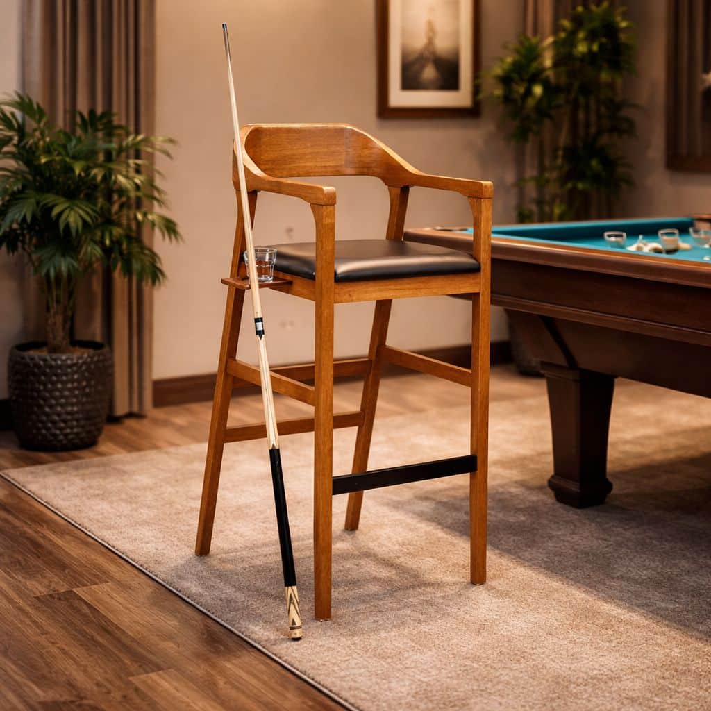 Elevate your game room or bar space with a barstool that’s as functional as it is refined. This extra-tall barstool blends timeless craftsmanship with smart, built-in convenience—perfect for entertaining, relaxing, or lining up the perfect shot. Crafted from rich, warm-toned wood, the stool features a sculpted wraparound back and armrests that provide both support and a distinctive, elevated look. The sleek black cushioned seat adds a layer of comfort, making it ideal for extended lounging or social gatherings. What truly sets this piece apart are its integrated features designed with recreation in mind. A discreet side-mounted cup holder keeps your drink secure and within reach, while the built-in pool cue holder offers a practical, space-saving solution for billiards enthusiasts. Whether you’re hosting friends or enjoying a quiet evening, everything you need stays right at your side.