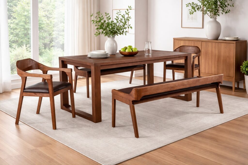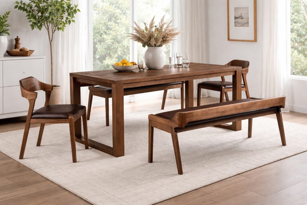 - The rustic dining set features a warm Chestnut wire-brush finish