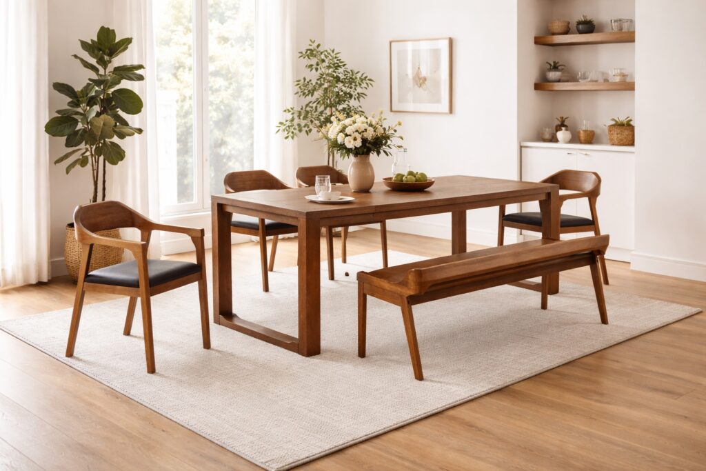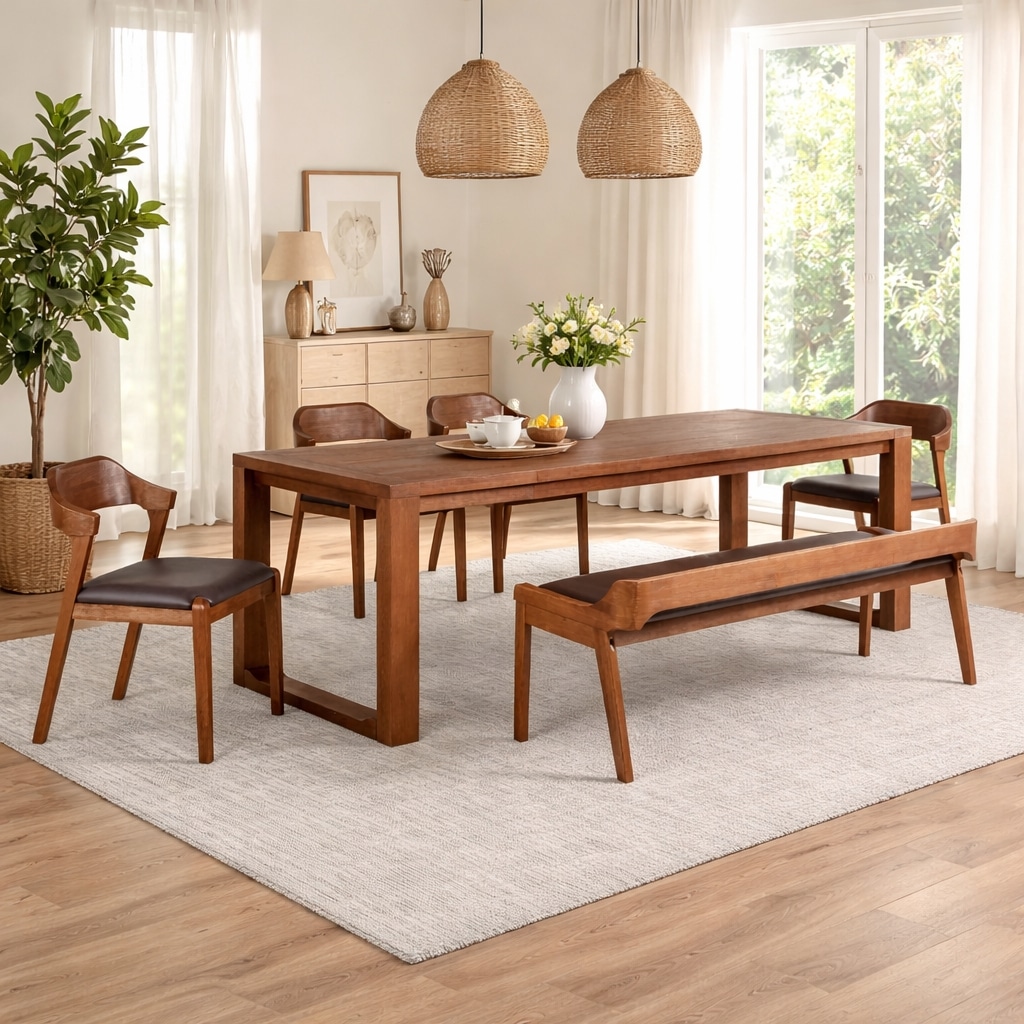 - The dining set includes 1 extension dining table, 1 dining bench, and 4 dining chairs