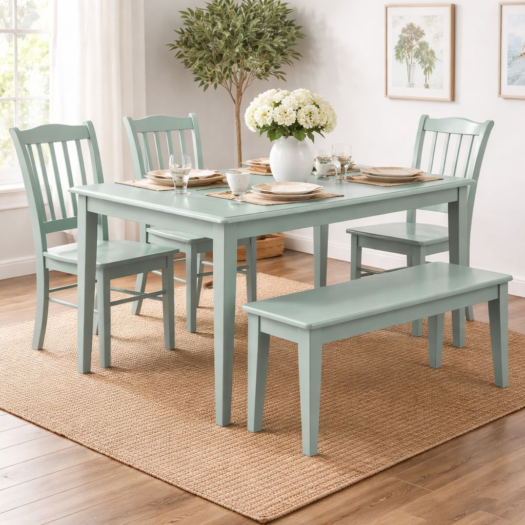 The Shaker 6-Piece Dining Set brings timeless Shaker design to your home, combining exceptional craftsmanship with lasting durability in a stylish ensemble. This wooden dining set comfortably seats six and includes one table, four matching slat-back chairs, and a backless bench. The chairs are designed with molded seats for enhanced comfort and stability, as well as stretchers for added longevity. Each foot is equipped with protective glides to prevent damage to your hard floors. A five-piece version of this set is also available from Boraam.