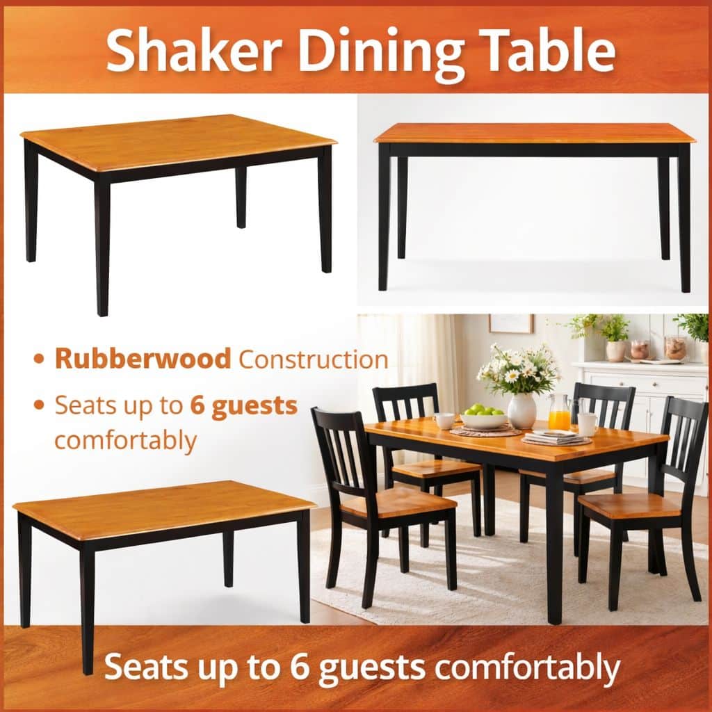 The Shaker Dining Table exemplifies why Shaker design never goes out of style. Quality craftsmanship meets timeless style, and the result is a staple that will sit in your dining room for years to come. The just-right size means the table offers spacious seating for two or comfortable seating for a party of six. For easy cleanup, wipe the table with a damp rag and mild dish soap. Complete the look with Boraam’s matching Shaker Chairs and Shaker Bench. Available in three different color options: Black & Oak, Oak, and Walnut.