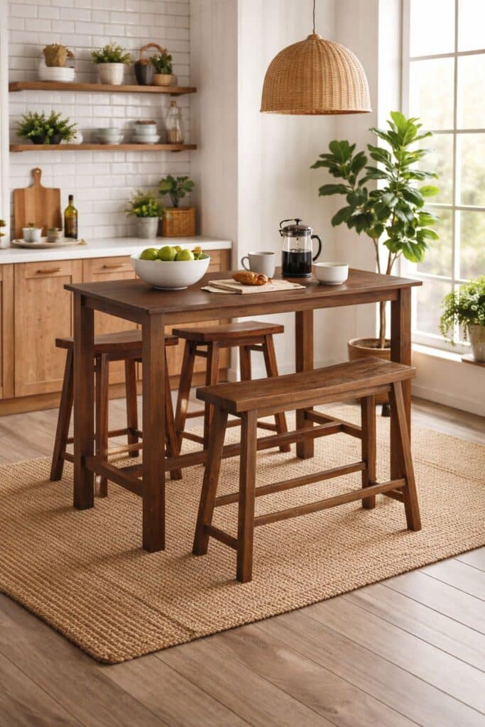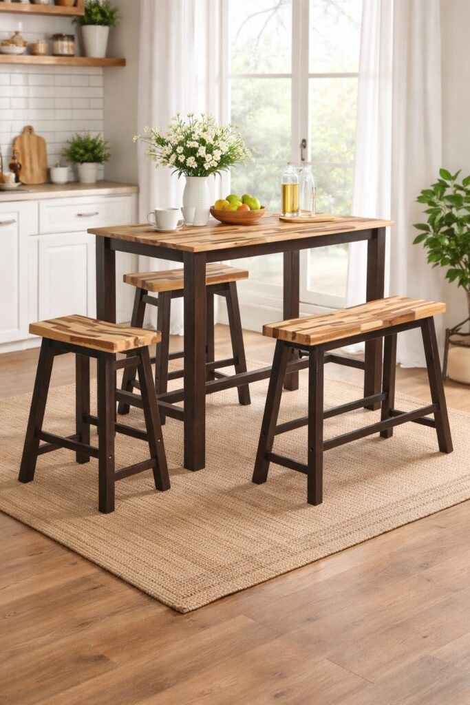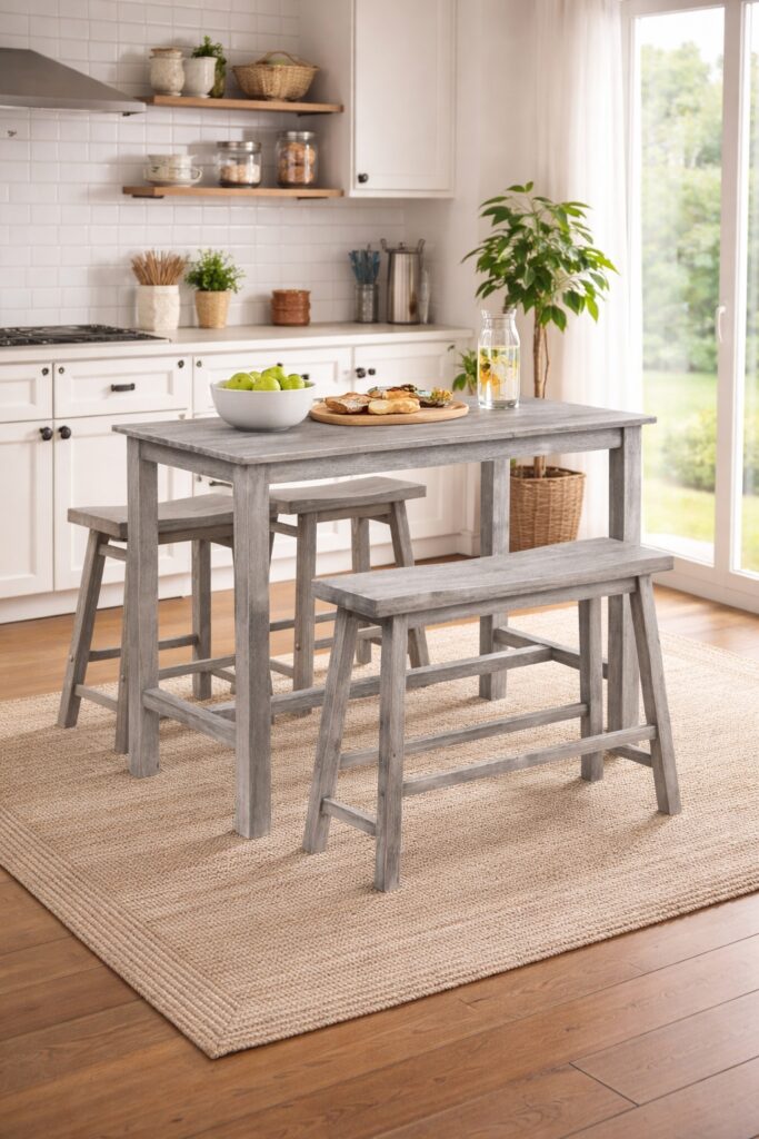 - Easily seats 4 people - Includes table, bench, and 2 stools