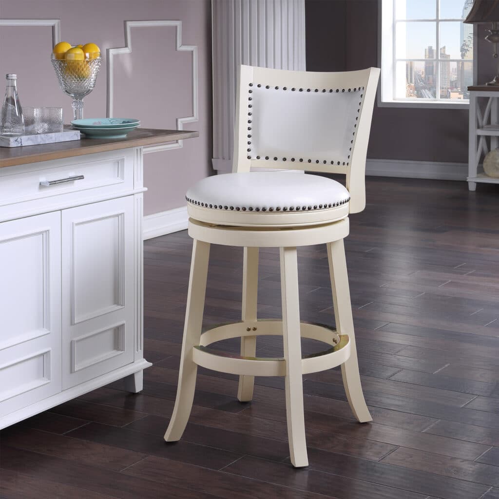 Elevate the look of your home with the Bristol Swivel Stool’s traditional style and classic comfort. Manufactured with precise attention to detail, the Bristol embodies comfort, durability, and style. In other words, it’s the complete package! It’s crafted from solid hardwood with a high-density foam seat and backrest cushion. Faux leather upholstery is accented by nailhead trim made from genuine brass. Each of the nailheads is applied individually by hand. On the base, flared legs and a stability stretcher offer enhanced durability and balance when you’re seated. The protective metal plate on the footrest guards against potential scuffs or scratches. The Bristol Swivel Stool is available in counter or bar height: simply choose your preference at checkout.