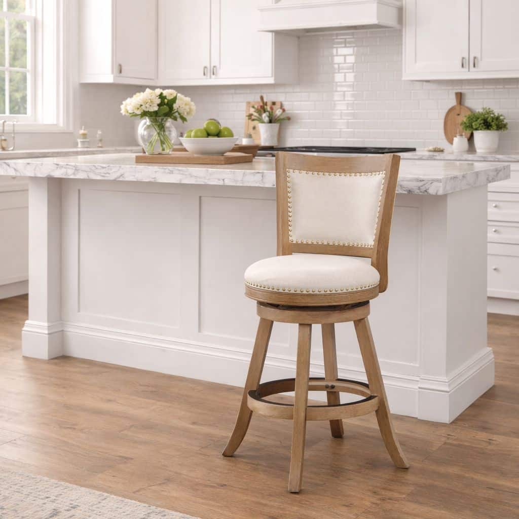 Transform your space with the stunning Melrose Swivel Stool, where style meets functionality. Its seat and backrest are elegantly embellished with antique brass nailheads, elevating the overall aesthetic. Experience luxurious comfort with the linen-upholstered high-density foam cushioning, beautifully trimmed with welt detailing. Durability is paramount, featuring a robust full-ring footrest and a protective metal kickplate that ensures longevity while enhancing comfort. The pièce de résistance is the ball-bearing steel swivel plate, engineered for a seamless full-circle swivel experience. Crafted from a solid rubberwood frame and finished with a meticulous multistep wire-brushed process, this stool is designed to withstand the test of time. Available in both counter and bar heights, it’s the perfect addition to your eat-in kitchen counter or pub table. Choose from our vibrant color combinations to find the perfect match for your home décor!