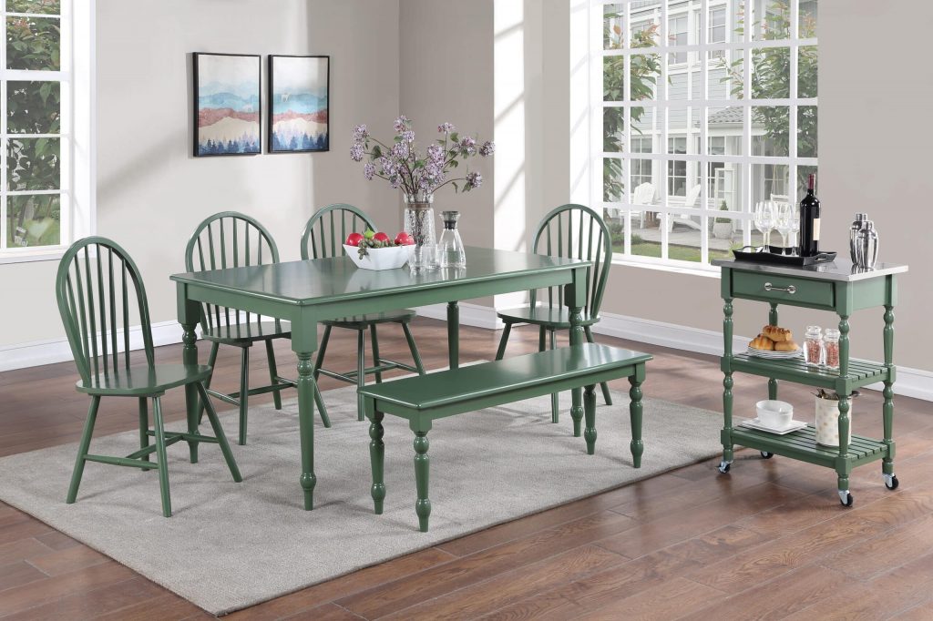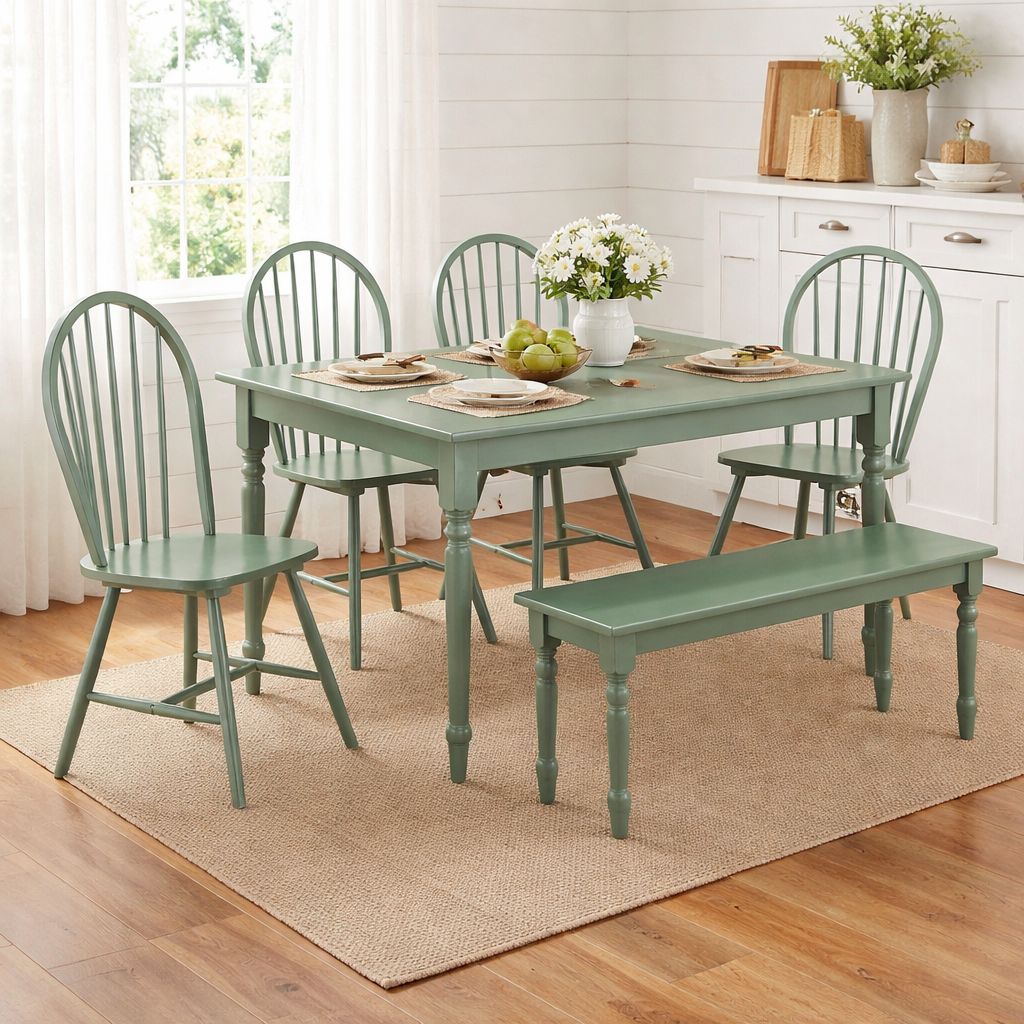 The set includes a spacious dining table, four Windsor-style chairs, and a coordinating dining bench, comfortably seating up to six guests. Classic turned legs and the signature spindle-back design add eye-catching character while enhancing the set’s traditional farmhouse appeal.