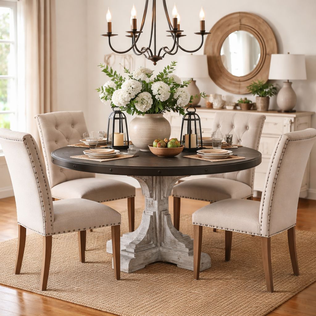 Sophistication and the Serrano Round Table go hand in hand. The table is crafted of solid reclaimed fir wood in a natural finish. A structural pedestal design on bottom balances out the metal rivet accents of the tabletop. Some assembly is required: simply attach the tabletop to the base prior to use. This table is perfect for a cozy eat-in kitchen.